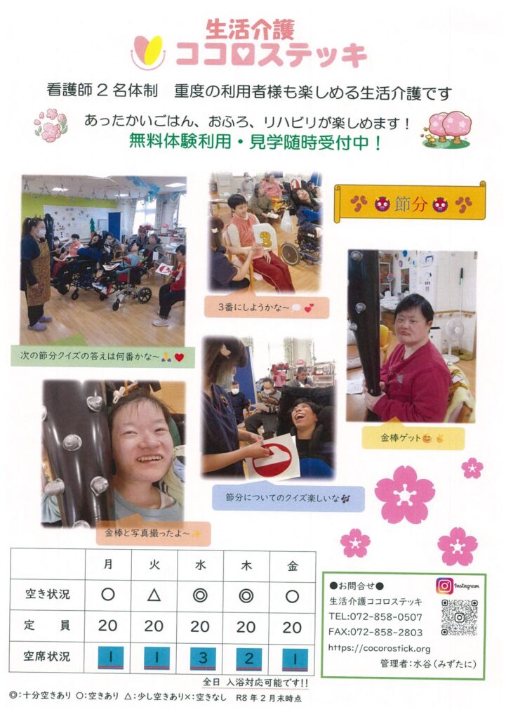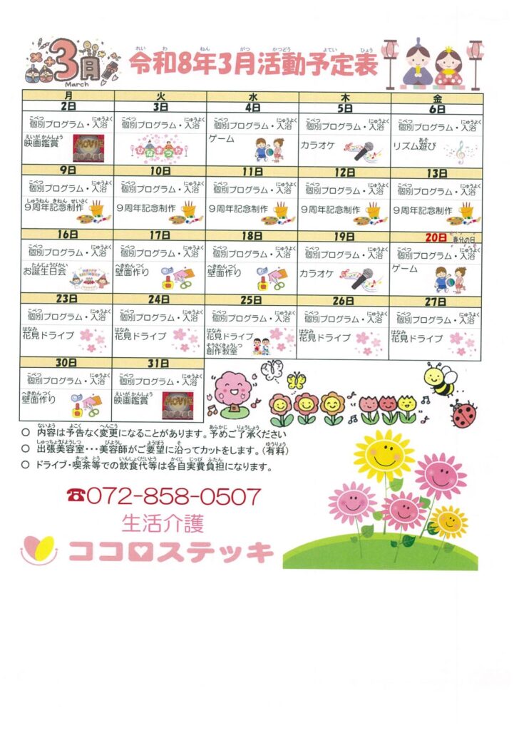 令和8年3月の生活介護ココロステッキの月間カレンダー、週間空き情報をお伝えします☺